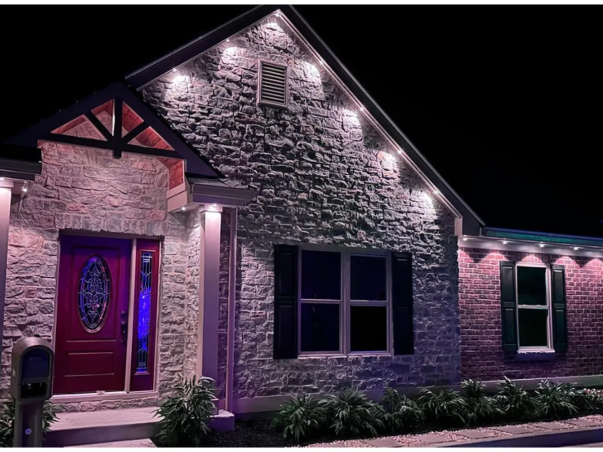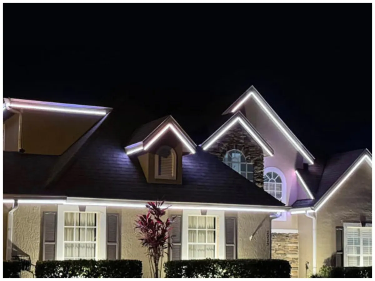 Architectural roofline lighting professionally designed and installed — customized through an on-site walkthrough to fit your home perfectly.